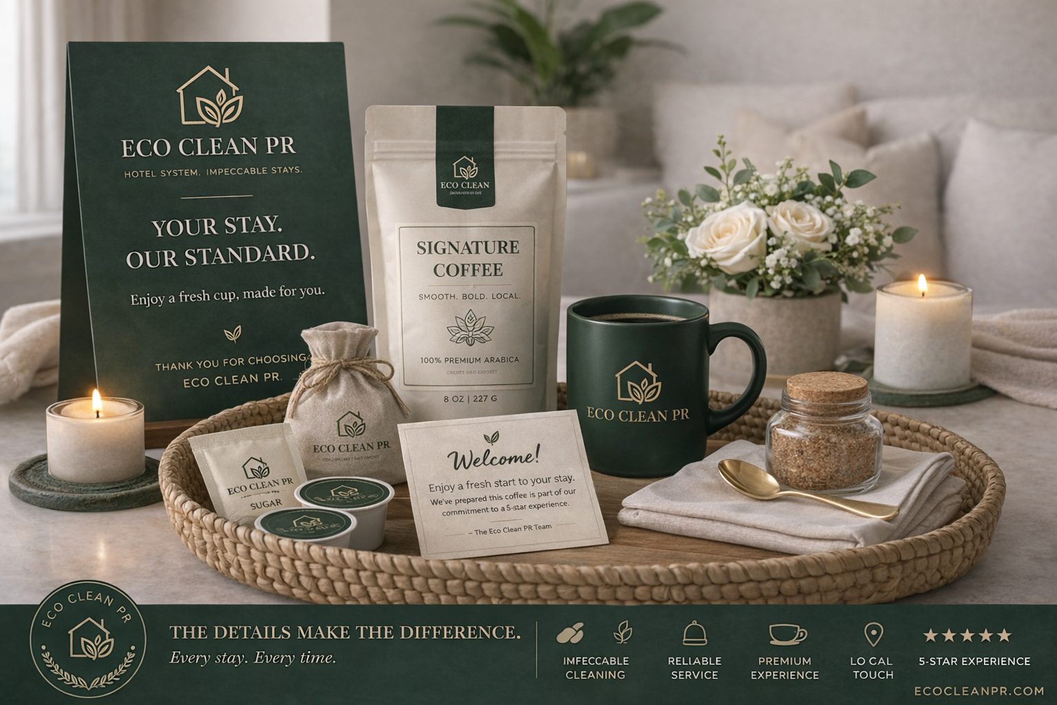 A Signature arrival setup designed to create an immediate emotional connection the moment the guest walk in. Every Eco Clean PR property is prepared with standardized welcome presentation -combining scent, visual order, and curated amenities to elevate perceived value and guest satisfaction.